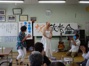 今夏は第9波を警戒して、参加者は対象者の3分の1でしたが、恒例の「お楽しみ会」は皆で唱歌や宮津節などを合唱し、芸達者な方々が登場して盛り上がりました。