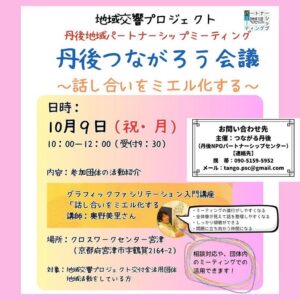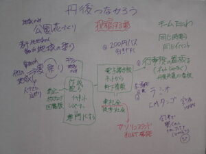 投稿日: 2023年10月9日2024年1月8日 投稿者: 宮津を元気にする会丹後つながろう会議 視覚表現を使って会議を円滑に進行する「グラフィックファシリテーション」の入門講座を兼ねた「丹後つながろう会議」に参加しました。 約4年間のコロナ禍で疎遠になっていますが… 丹後地域の地域活性化を目指したNPO法人team旦波(たにわ)で学んだアイデアを思い出しながら「丹後がつながる」ディスカッションをしました。 改めて丹後が繋がる大切さを実感します。