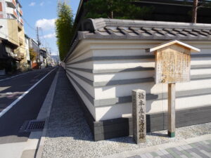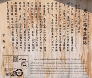 福井(越前)藩邸跡は、二条城 東大手門(正門)前にあり、この辺りは京都三井家の邸宅跡や宮津藩の本庄家を興した桂昌院(5代将軍 徳川綱吉の母)の生家(八百屋)の菩提寺 真敬寺(しんきょうじ)や本能寺跡など観光スポットが沢山あります。
