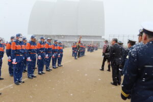 消防団員の表彰式・閲団・宮津湾への一斉放水・観閲とパレードが行われました。